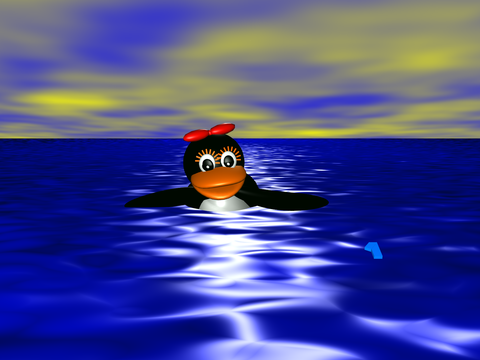 One little penguin jumped into the water. It was a wonderful bright and sunny day and Gini was happy. The water was warm, ideal for bathing. She swam around and around enjoying herself a lot.
