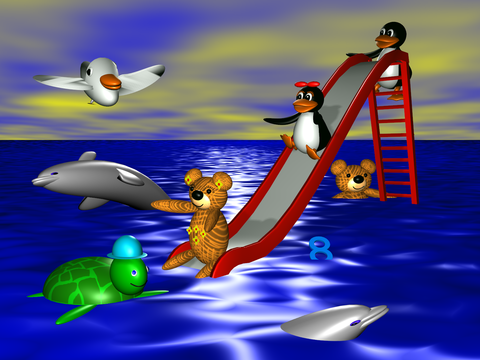 After they had enough of their water dancing they went to a water slide. Of course everyone had to slide down with a big splash! They slid down the slide again and again making bigger splashes every time. Emma, the sea bird got curious and came flying by to see what was going on.