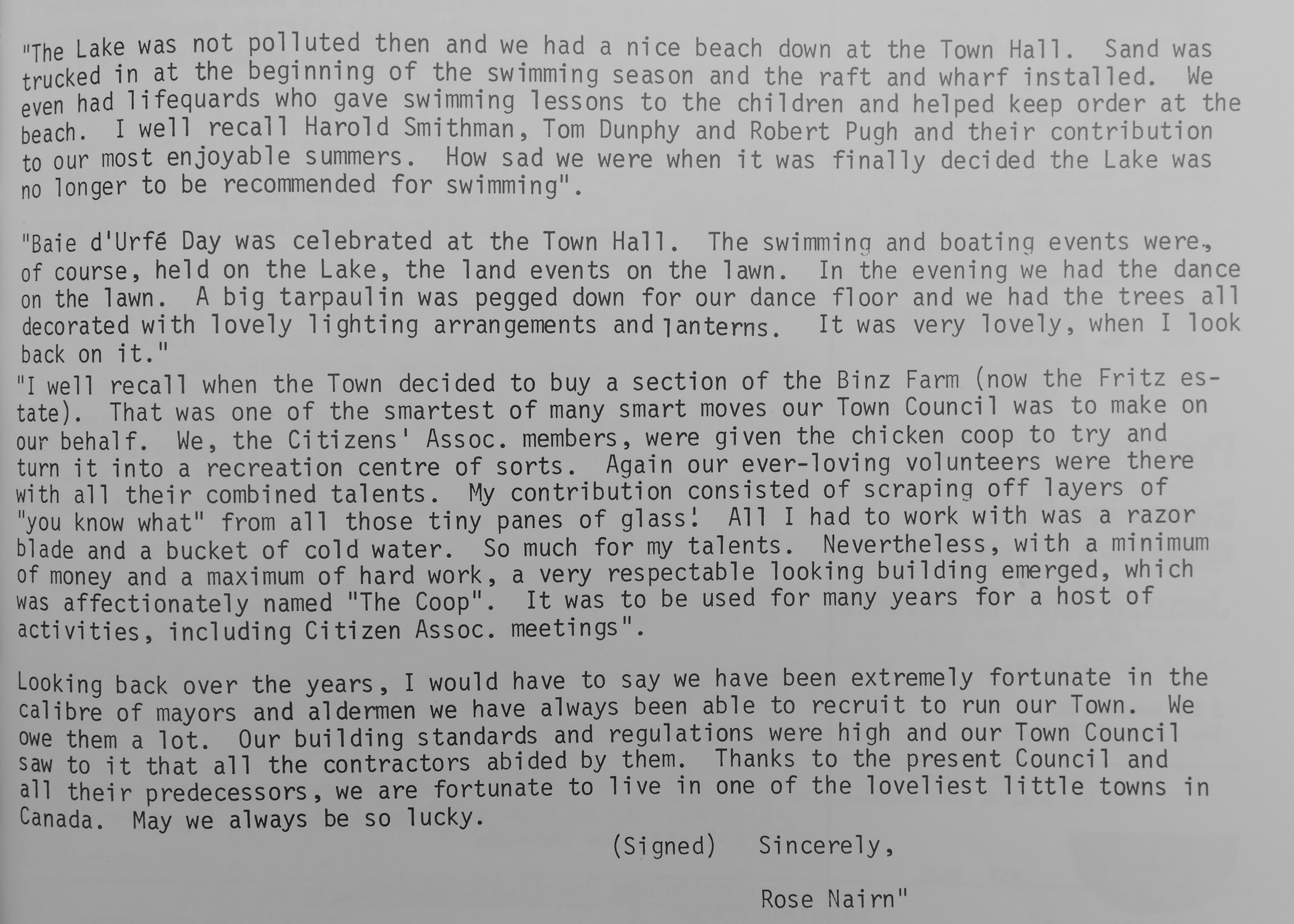 "There was no organized recreation then, no hockey teams, no baseball teams, no skating rinks, no Cubs or Brownies. All these were to come later, thanks to hours of hard wor by dedicated volunteers. Baie d'Urfé certainly owes a debt of gratitude to them. Names that come readily to my mind are Lee, Mitcham, Proudfoot, Avey, Lothian, Norcott, Parker Vauthier, Higman, Ellis, Tait, the late Charlie Johnstone and Jim Gudewill. There were many more. Even then we had a very active Citizens' Assoc., which certainly made, and still continues to make, a valuable contribution to the good life we have here in Bale d'Urfé."